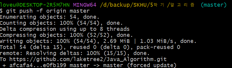 문제 상황은 로컬 마스터에서 원격으로 올라가는 과정에서 변경 사항이 있기 때문에 그 충돌을 해결해야하는 것이 되겠다. 하지만 나는 지금 최신 상황이 반영되지 않는 상황이므로, 강제로 push를 진행하는 git push --force <remote_repository>를 수행해주었다.